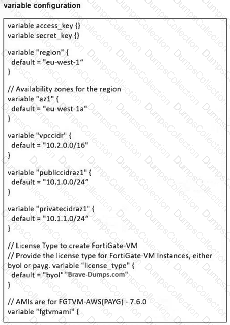 You are tasked to deploy a FortiGate VM with private and public subnets in Amazon Web Services (AWS). You examined the variables.tf file. Assume that all the other terraform files are in place. What will be the final result after running the terraform init and terraform apply commands? (Choose one answer)
