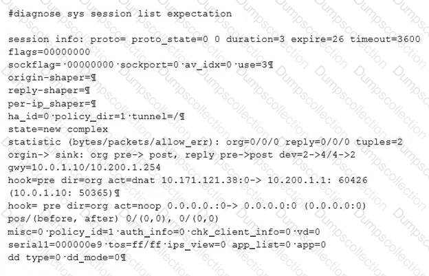 Examine the output of the ‘diagnose sys session list expectation’ command shown in the exhibit; than answer the question below.