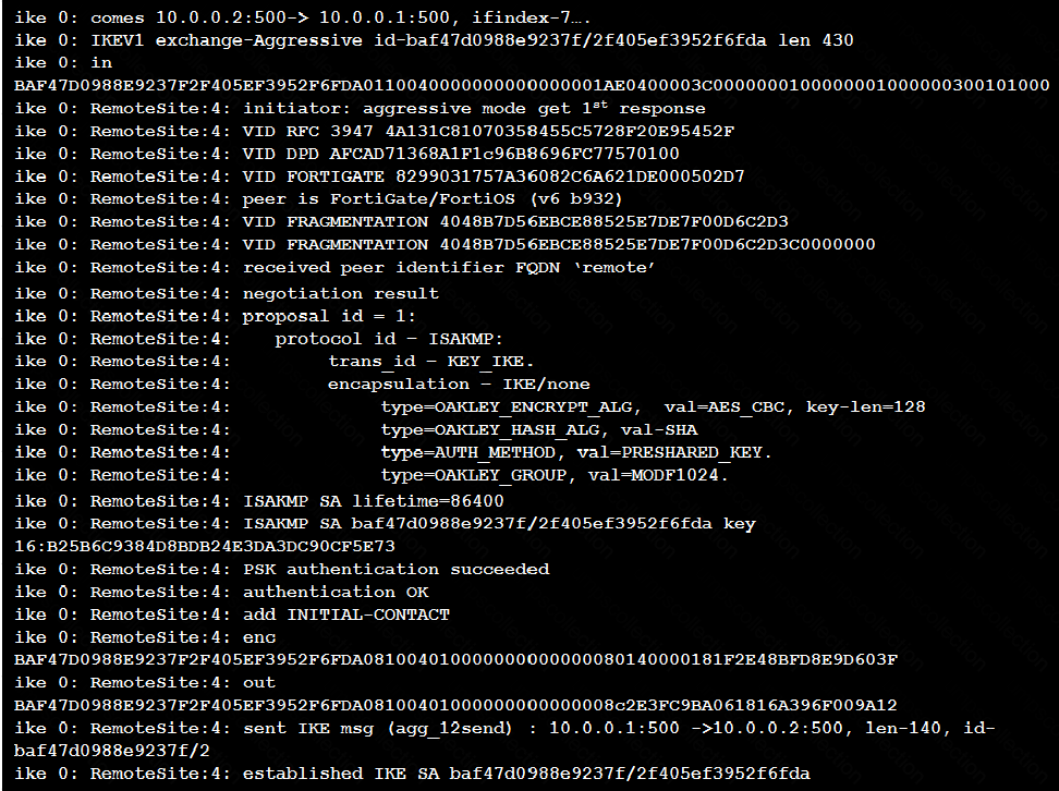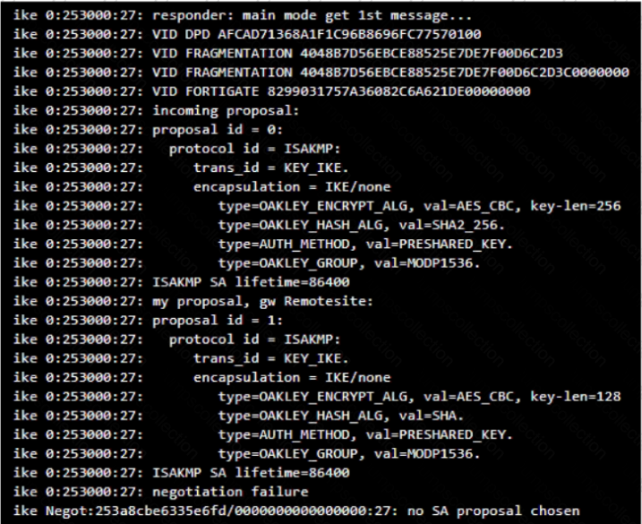 View the exhibit, which contains the partial output of an IKE real-time debug, and then answer the question below.