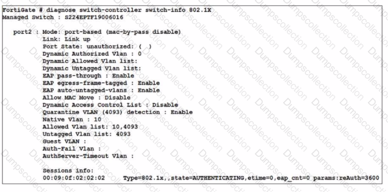 A device connected to port2 on FortiSwitch cannot access the network The port is assigned a security policy to enforce 802 1X authentication While troubleshooting the issue, the administrator obtains the debug output shown in the exhibit