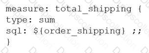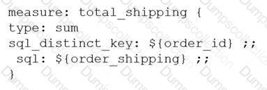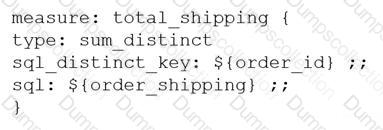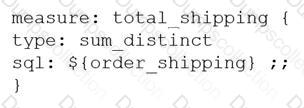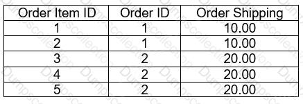 A LookML Developer is working with denormalized tables and needs to create a measure adding up the Order Shipping column in the tablebelow:
