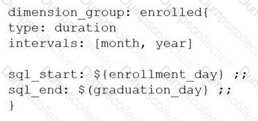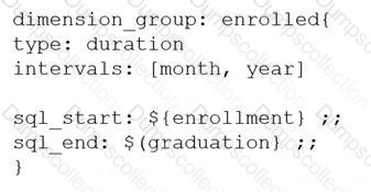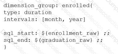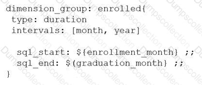 A developer has the dimensions enrollment_month and graduation_month already defined in the view. Both were created as part of dimension_groups of type: time. The developer need touse these two dimensions in the sql_start and sql_end parameters of a dimension group of type: duration.