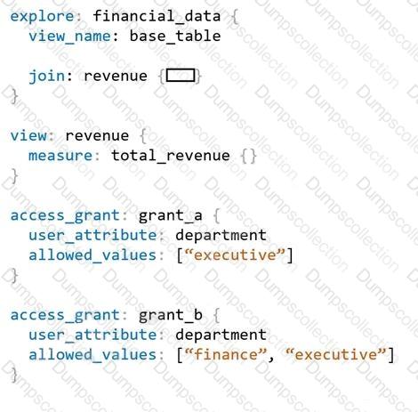 Only users with department attributes of Finance and Executive should be able to access the revenue view. Only users with the value ofExecutive for the department user attribute should be able to view the total_revenue field.