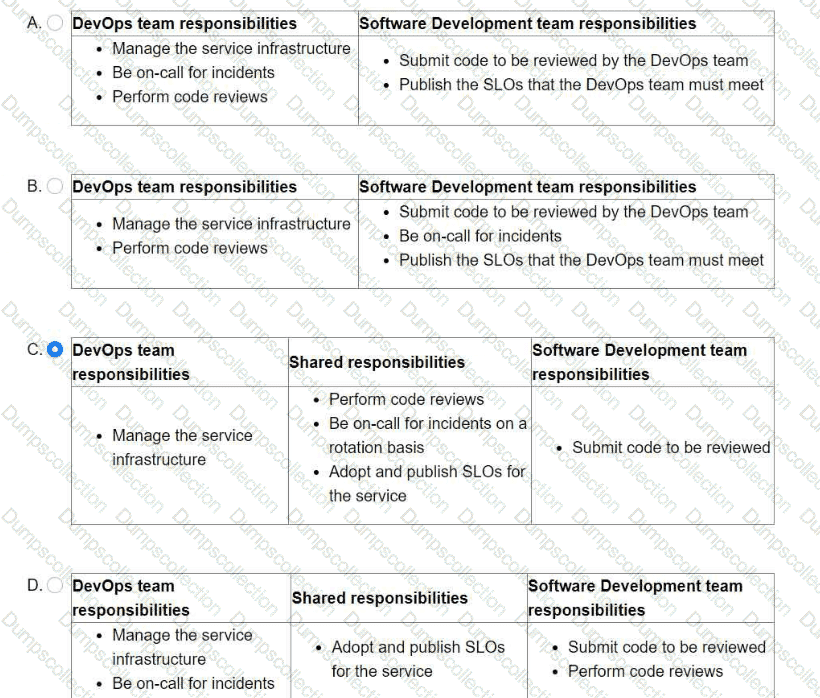 You are leading a DevOps project for your organization. The DevOps team is responsible for managing the service infrastructure and being on-call for incidents. The Software Development team is responsible for writing, submitting, and reviewing code. Neither team has any published SLOs. You want to design a new joint-ownership model for a service between the DevOps team and the Software Development team. Which responsibilities should be assigned to each team in the new joint-ownership model?
