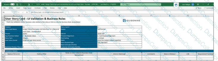 At Succeed Insurance, new personal auto claims involving a fatality are assigned to a High Complexity Auto group made up of Adjusters with at least eight years of experience dealing with the issues and emotions commonly found in claims involving fatalities. Fatality claims typically take 18 to 24 days to complete. The assigned Business Analyst (BA) will document the assignment rule for this requirement in User Story Card Assign Claims Exposures and Activities for a Personal Auto Claim - Foundational. The existing tab UI Validation & Business Rules shown below is not a good fit for assignment rules, so a new tab will be added to the Story Card.