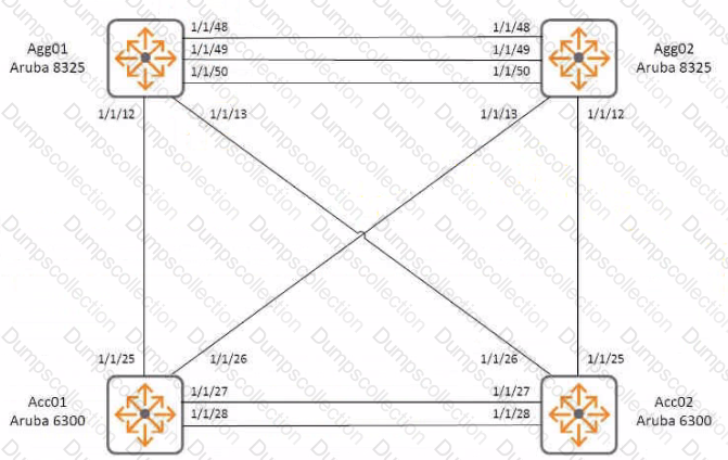 The ports of the Aruba 8325 switches used for Agg01 and Agg02 are populated as follows: