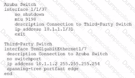 A customer wants to verify the proposed configuration snippets to create a point-to-point link between Aruba Switch and a third-party switch.