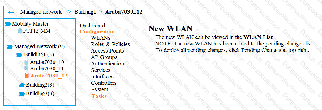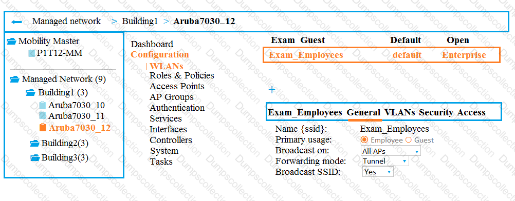 A company has an Aruba Mobility Master (MM)-based solution and needs a new WLAN for the corporate campus. A network administrator completes the creation of this WLAN, as shown in Exhibit 1. When the administrator tries to test a connection to the WLAN in various locations, the WLAN sometimes shows up in the list of WLANs on the client but sometimes does not. The administrator can see the WLAN in the list, as shown in Exhibit 2.