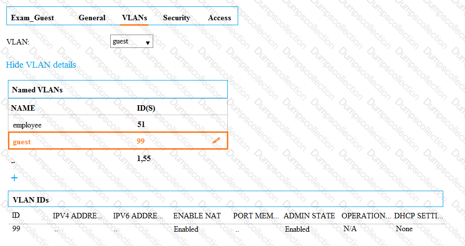 A network administrator configures a guest WLAN on an Aruba Mobility Master (MM)-based solution. The exhibits show some of the settings for this WLAN.
