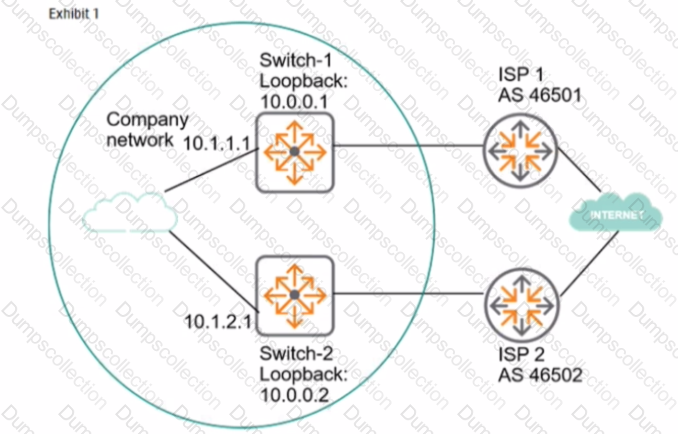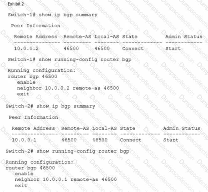 The network administrator needs to set up BGP between the two company switches. Switch-1 and Switch-2. The BGP connection does not establish. Based on the exhibits, what does the administrator need to do to fix the issue?