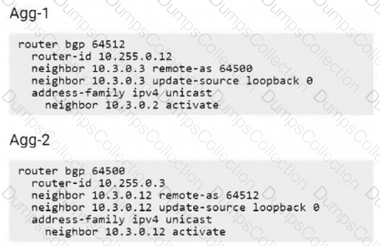A junior engineer has configured eBGP between two CX switches (Agg-1 and Agg-2) using the configuration below, and tells you that the neighbors are in the ‘Active’ state.