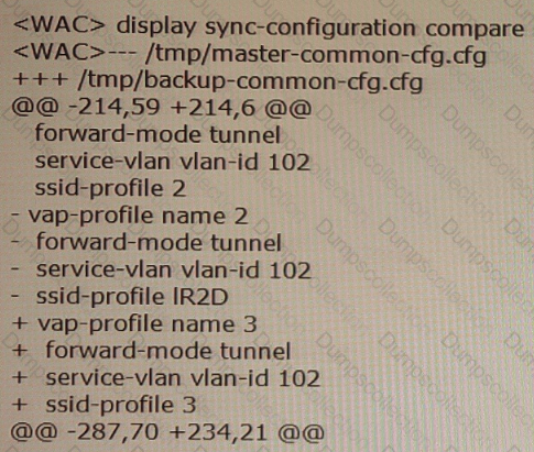 The display sync-configuration compare command is executed on the backup WAC in HSB to check wireless configuration synchronization. Based on the command output, which of the following statements are true? (Select All that apply)