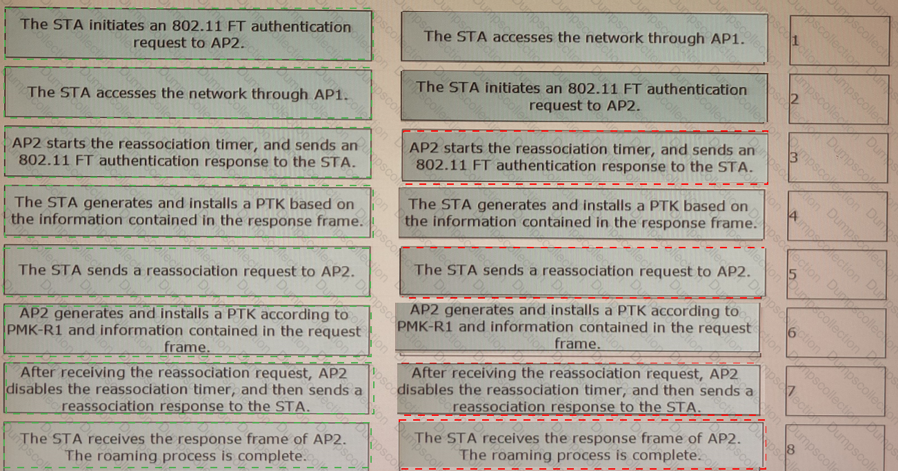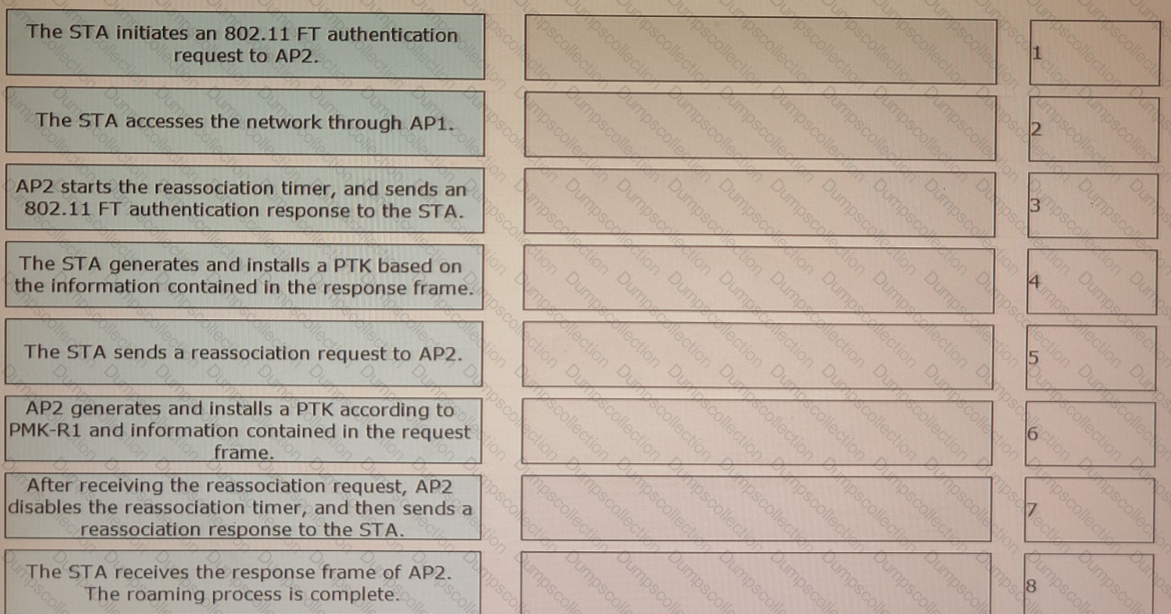 802. 11r fast roaming (over-the-air) is enabled on the WLAN shown in the figure. A STA roams from AP1 to AP2. Sort the steps in chronological order during the 802.11r fast roaming process between WACs.