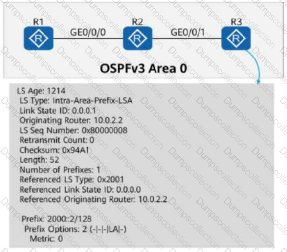 If you check detailed information about an LSA on R3, the command output shows that the LSA is generated by R2 and describes the IPv6 prefix address associated with the Router-LSA.