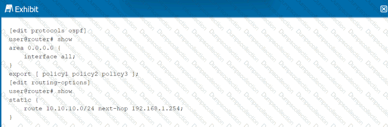 Referring to the exhibit, OSPF has three export policies that match different static route prefixes. The 10.10.10.0/24 static route does not match any terms in the policyl routing policy.