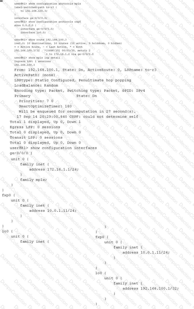 You have configured an MPLS LSP to 192.168.100.3. However, the LSP is in the down state. Referring to the exhibit, which two actions would solve this problem? (Choose two.)