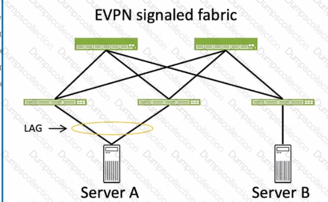 To answer this question, we need to understand the concept of ESI values in EVPN LAGs. An ESI is a 10-byte value that identifies an Ethernet segment, which is a set of links that connect a multihomed device (such as a server) to one or more PE devices (such as leaf switches) in an EVPN network. The same ESI value must be configured on all the PE devices that connect to the same Ethernet segment. This allows the PE devices to form an EVPN LAG, which supports active-active or active-standby multihoming for the device. The ESI value can be manually configured (type 0) or automatically derived from LACP (type 1) or other methods. In the exhibit, Server A is connected to two leaf switches (QFX 5210) using a LAG with LACP enabled. Server B is connected to three leaf switches (QFX 5120) using a LAG with LACP enabled. Based on this information, the following statements are correct about ESI values for the server connections to the fabric: