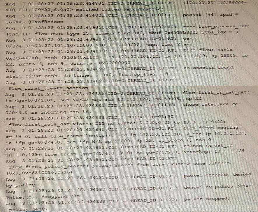 You are asked to establish an IBGP peering between the SRX Series device and the router, but the session is not being established. In the security flow trace on the SRX device, packet drops are observed as shown in the exhibit.