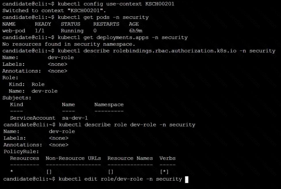 A Role bound to a Pod's ServiceAccount grants overly permissive permissions. Complete the following tasks to reduce the set of permissions.