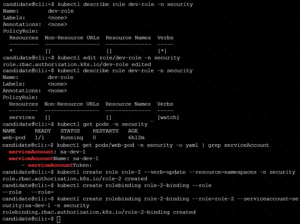 Create a new RoleBinding named role-2-binding binding the newly created Role to the Pod's ServiceAccount.