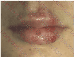 [Image shows grouped vesicular lesions on erythematous base affecting the lips—classic for herpes labialis (HSV-1).]