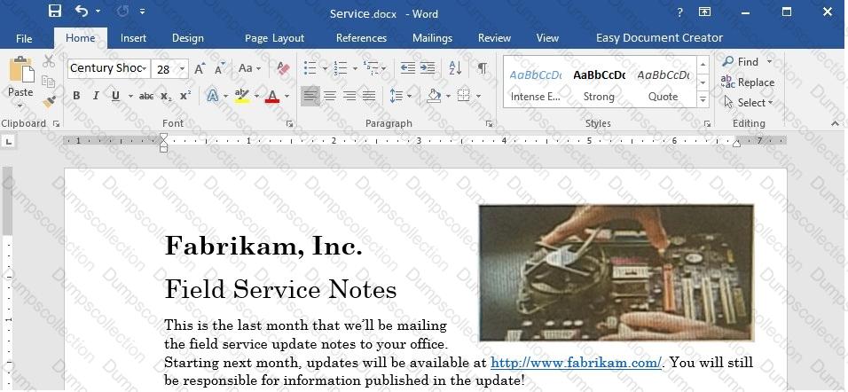 You are an administrative assistant for Fabrikam, Inc.’s Field Service division. You are preparing the monthly newsletter to be sent out to field service engineers.