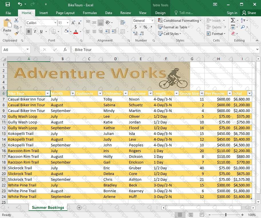You are the owner of a small bicycle tour company summarizing trail rides that have been booked for the next six months.