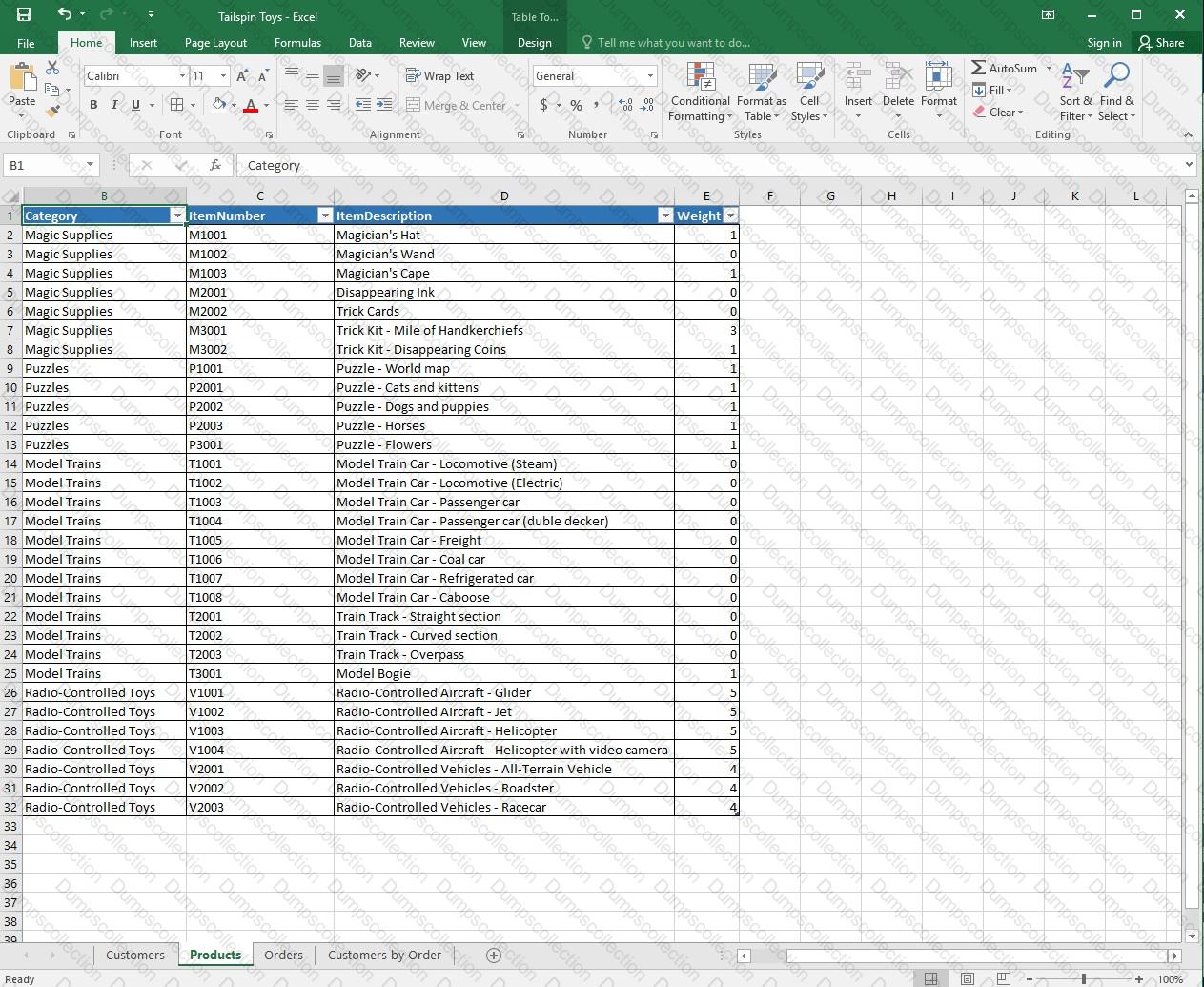 On the “Products” worksheet, apply a number format to display the numbers in the “Weight” column to three decimal places.