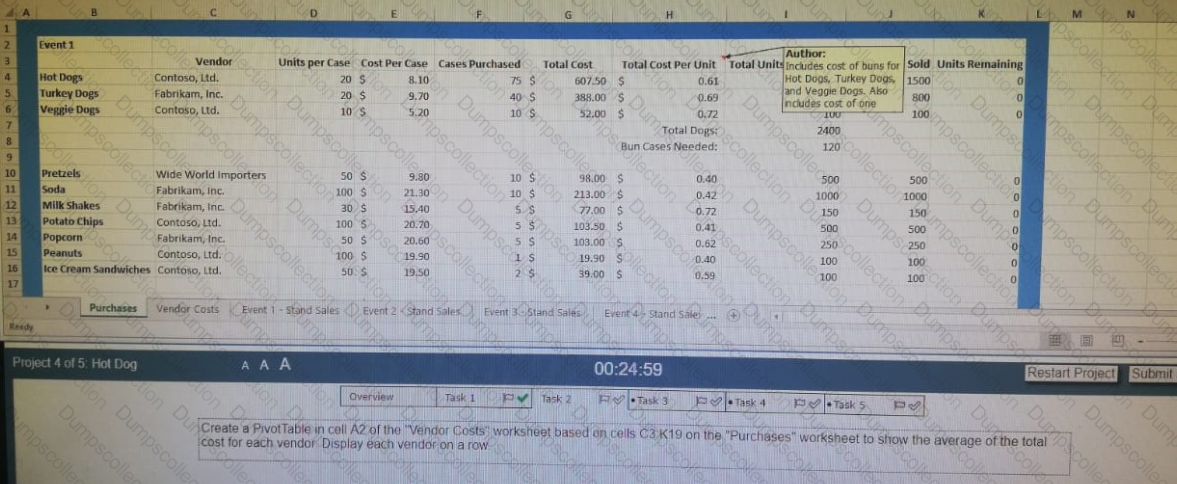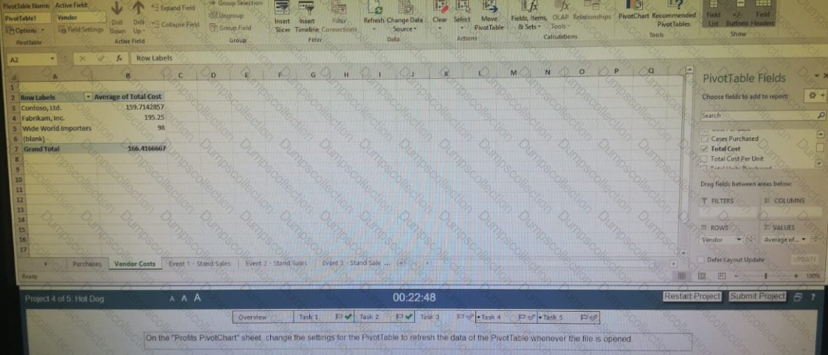 Create a PivotTable in Cell A2 of the “Vendor Costs” worksheet based on cells C3 K19 on the “Purchases” worksheet to show the average of the total cost for each vendor. Display each vendor on a row.