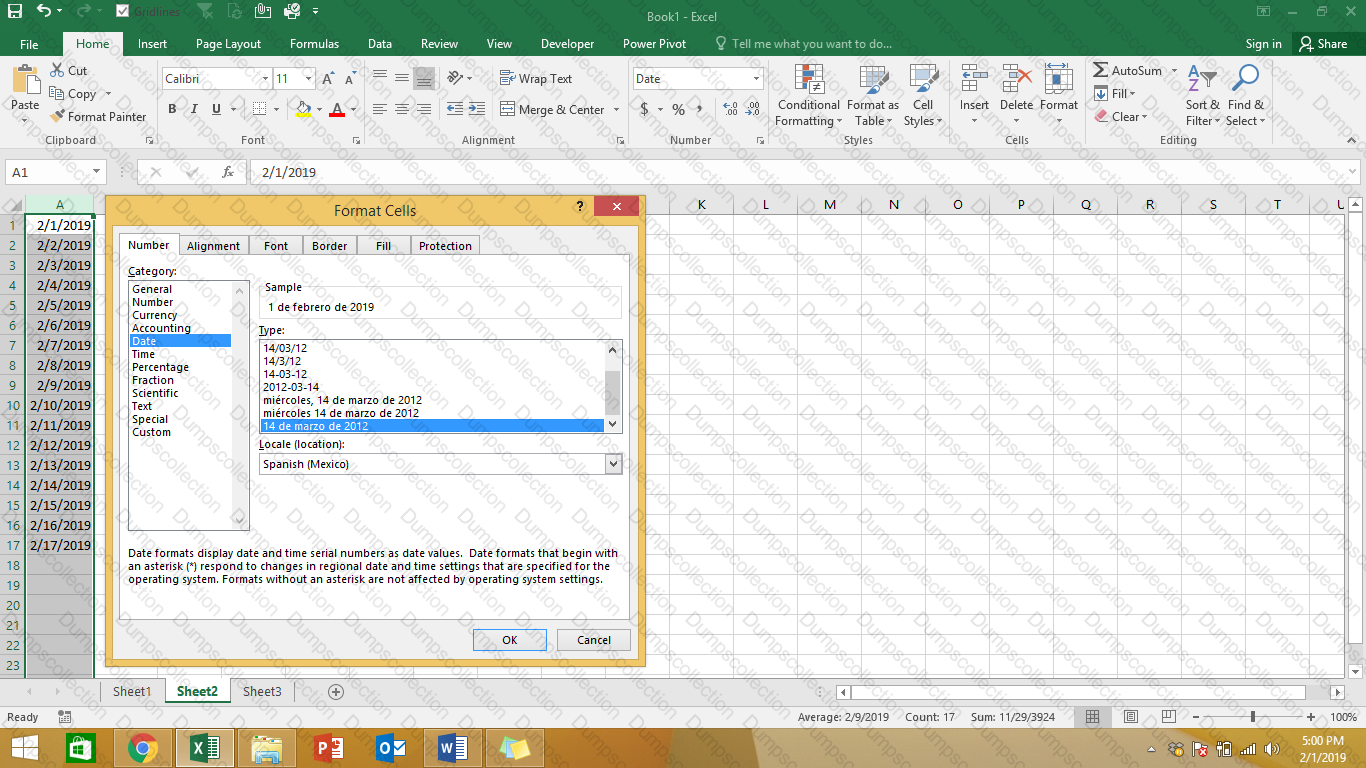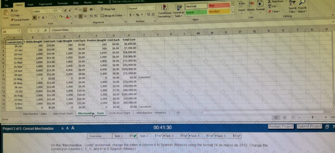 On the “Merchandise-Costs” worksheet, change the dates in column A to Spanish (Mexico) using the format 14 de marzo de 2012. Change the currency C, E, G and H to $ Spanish (Mexico)