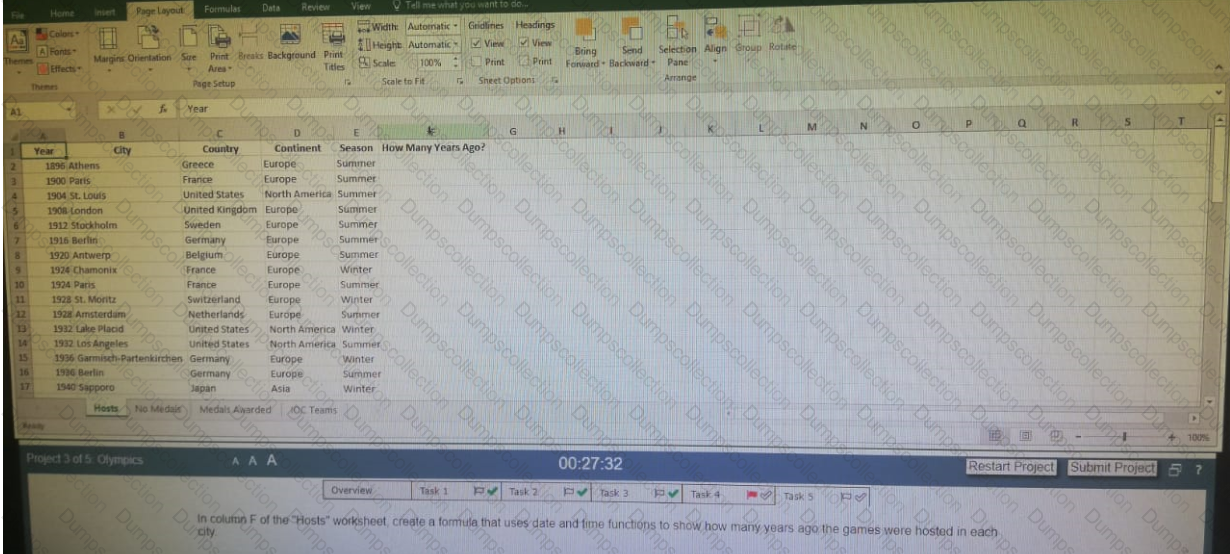 In column F of the “Hosts” worksheet, create a formula that uses date and time functions to show how many years ago the games were hosted in eachcity.