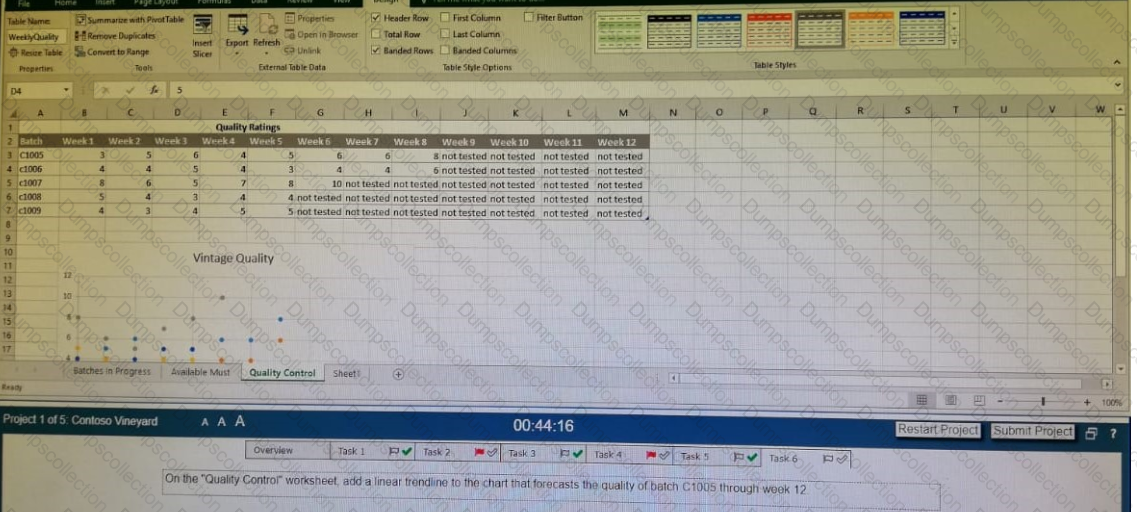 On the “Quality Control” worksheet add a linear trendline to the chart that forecast the quality of batch C1005 through week 12.