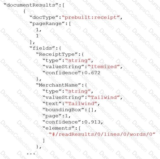 You upload the receipt images to the From Recognizer API for analysis, and the API ret urns the following JSON.
