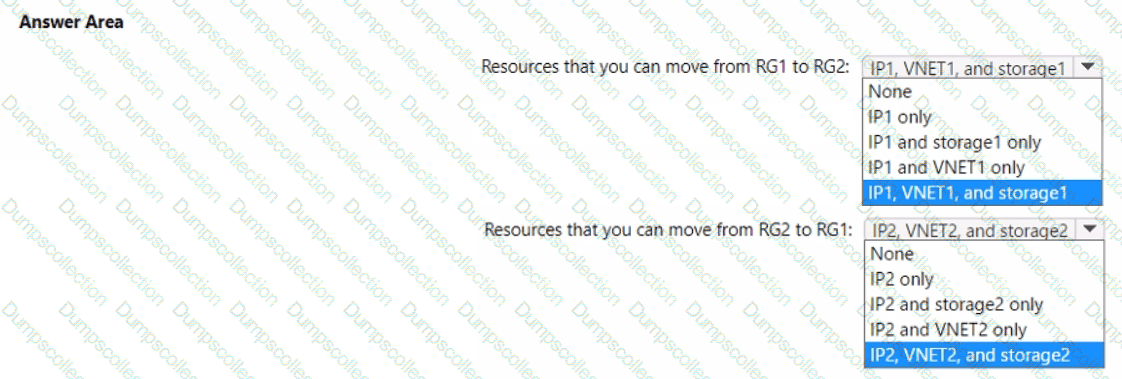 You need to identify which resources you can move from RG1 to RG2, and which resources you can move from RG2 to RG1. Which resources should you identify? To answer, select the appropriate options in the answer area.