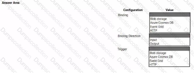 How should you configure the solution? To answer, select the appropriate options in the answer area.