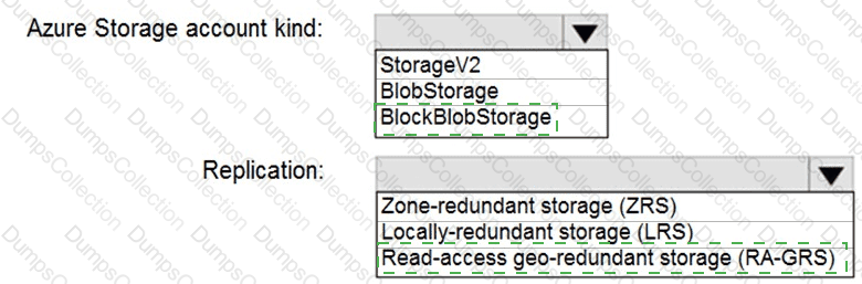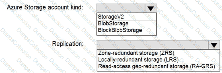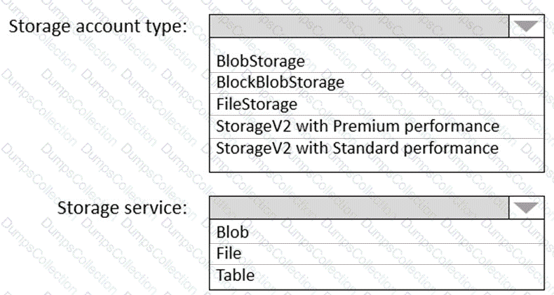 Which Azure Storage account type and storage service should you recommend? To answer, select the appropriate options in the answer area.