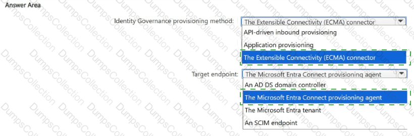 You need to recommend a Microsoft Entra Identity Governance provisioning method and a target endpoint for creating new user accounts.