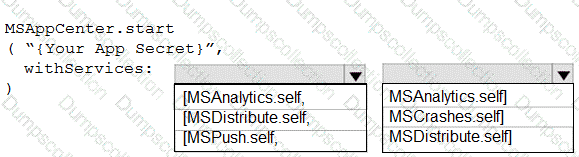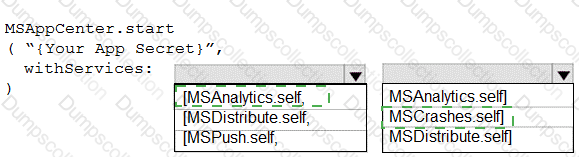How should you complete the code to initialize App Center in the mobile application? To answer, select the appropriate options in the answer area.