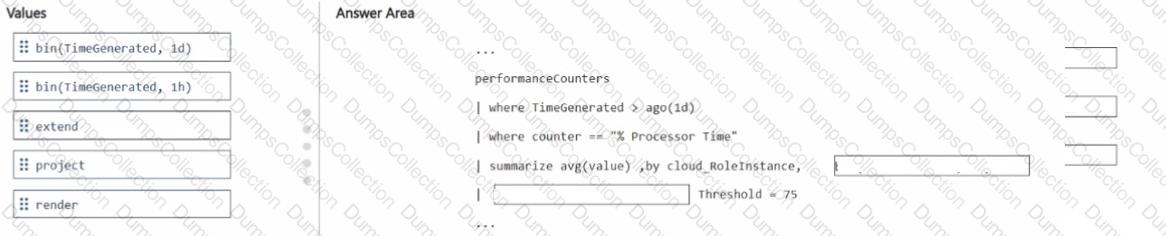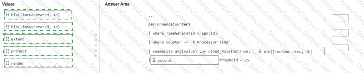 How should you complete the query? To answer, drag the appropriate values to the correct targets. Each value may be used once, more than once, or not at all. You may need to drag the split bar between panes or scroll to view content.
