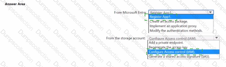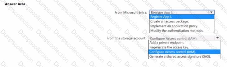 You have an Azure Storage account that contains a blob container named container! and a client application named App1. You need to enable App1 access to container1 by using Microsoft Entra authentication. What should you do? lo answer, select the appropriate options in the answer area. NOTE: Each correct selection is worth one point.