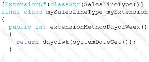 You must extend the class SalesLineType and add a new method that returns the day of week for the system’s current date as an integer value.