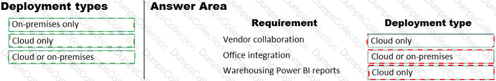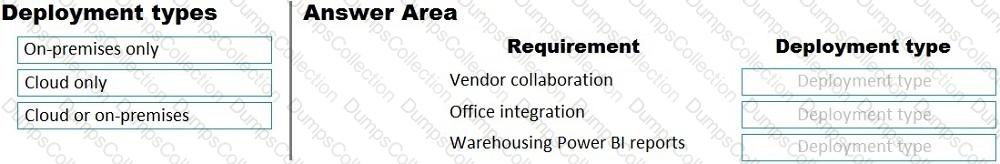 You need to recommend a cloud or on-premises solution based on the customer’s business requirements. Which deployment type should you recommend? To answer, drag the appropriate deployment types to the