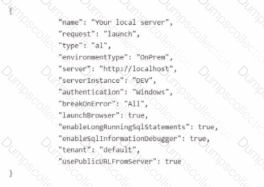 A company has an on-premises Business Central instance named TEST The instance uses Windows authorization and a developer services port of 7149 Visual Studio Code is installed on the same server.