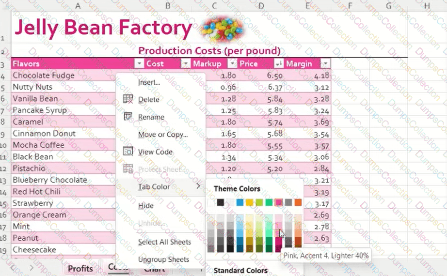 Group the Profits, Costs, and Chart worksheets and change the tab color to Pink, Accent 4.
