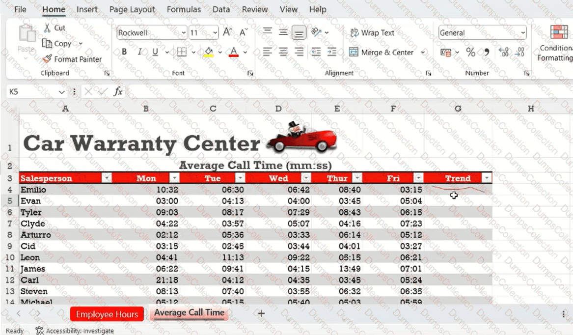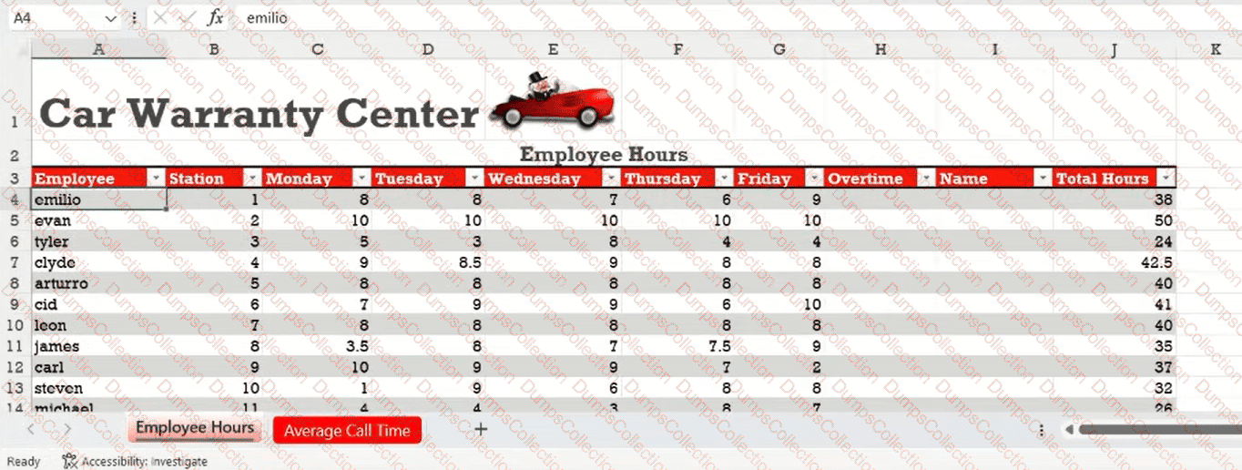 You are the supervisor for a Car Warranty Center. You use Excel to report employee hours and telephone calls.