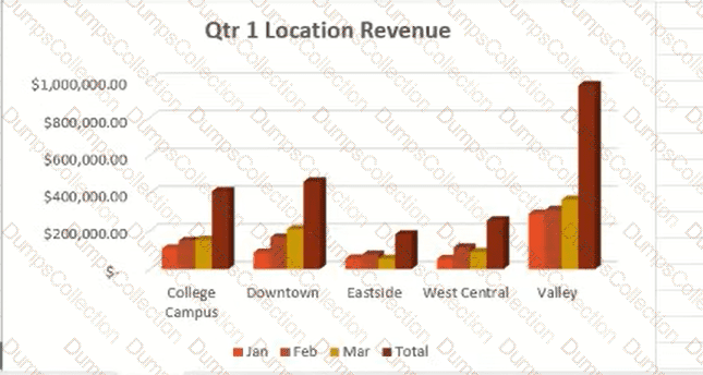 In the Qtr 1 worksheet change the configuration of the Q1 Location Revenue chart so that it displays the months on the x-axis and the revenue on they-axis.
