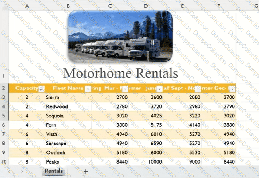 Your company rents motorhomes. The motorhomes rent year-around at different prices. You are preparing pricing worksheets to be shared with others.