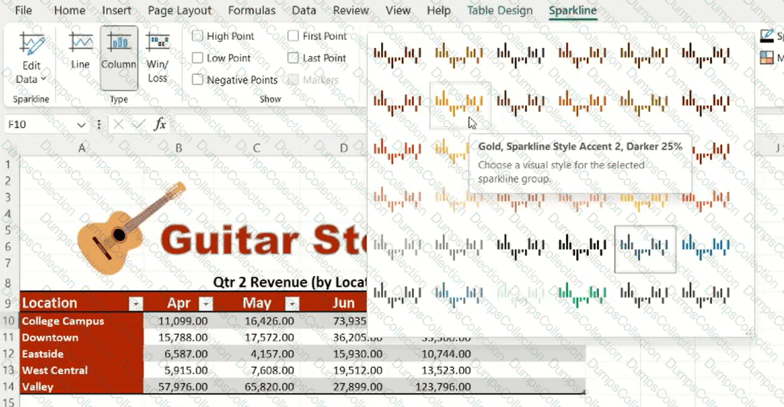 On the Qtr 2 worksheet, in cell F10, insert a column sparkline showing the sales trend from Apr through Jun. Apply Gold, Sparkline Style Accent 2,Darker 25% to the sparkline. Copy the sparkline to the remaining cells in the column, F11:F14.
