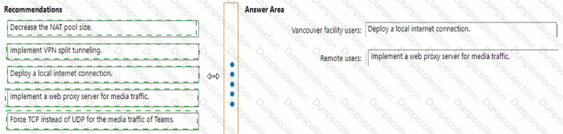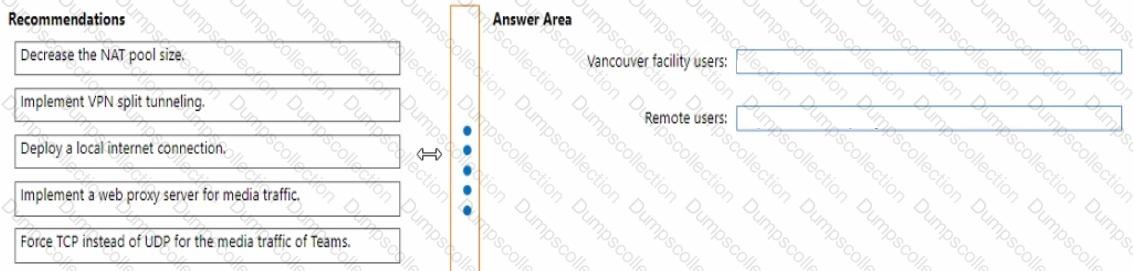What should you recommend for the Vancouver facility users and the remote sale team users? To answer, drag the appropriate recommendation to the correct users. Each recommendation may be used once, more than once, or not at all. Vou may need to drag the split bar between panes or scroll to view content