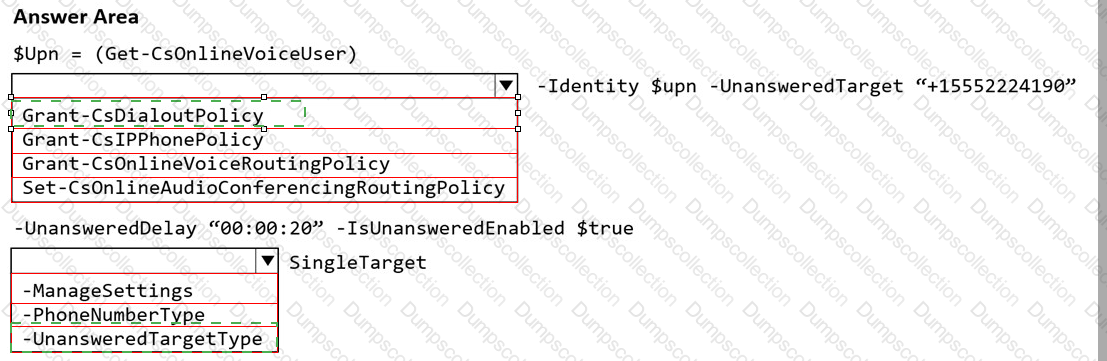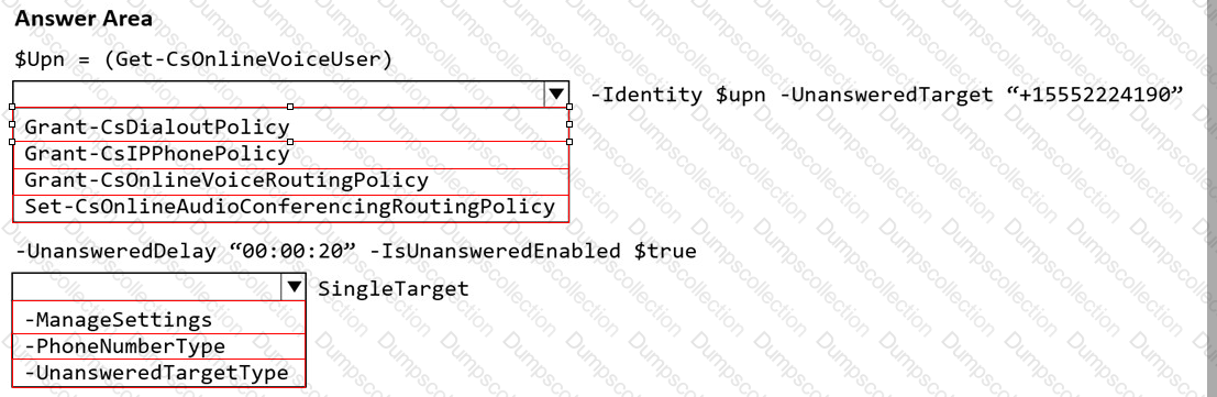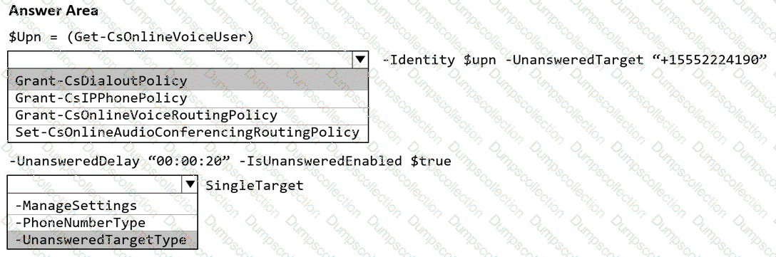 You need to ensure that incoming calls to a user are forwarded to a phone number of +15552224190 if the calls are NOT answered within 20 seconds.